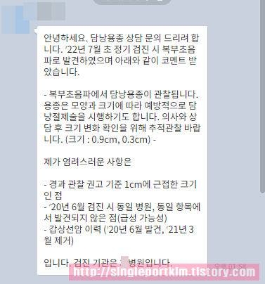 ‘22년 7월 초 정기 검진 시 복부초음파로 발견하였으며 아래와 같이 코멘트 받았습니다.