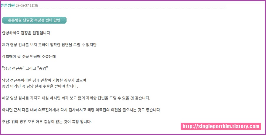 | 담낭선근종이라고 진단 받았고 소화불량이 심하면 대학병원에서 간담도 스캔 검사를 받아보라고 해서... (0) | 2025.06.25 |