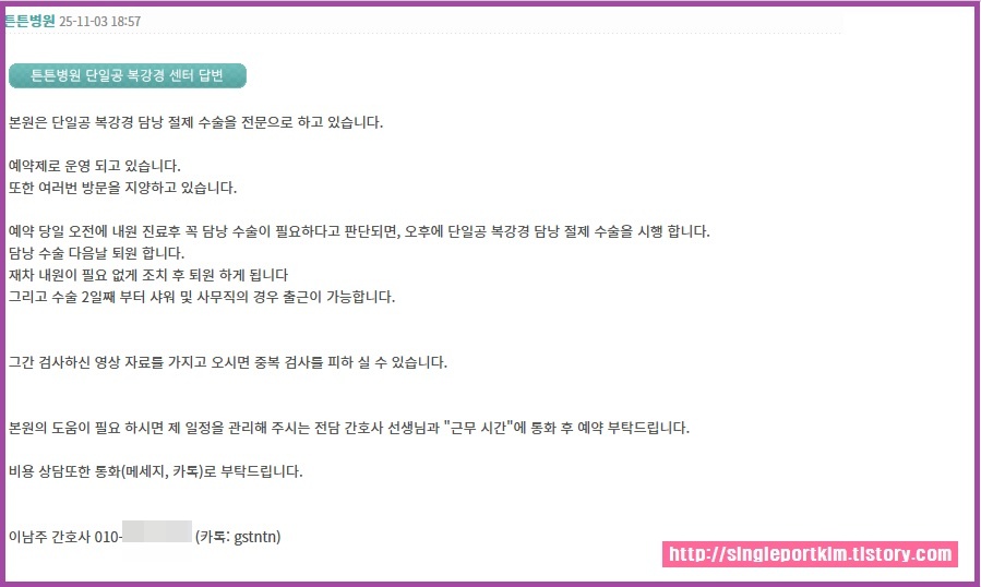 오후에 단일공 복강경 담낭 절제 수술을 시행 합니다.