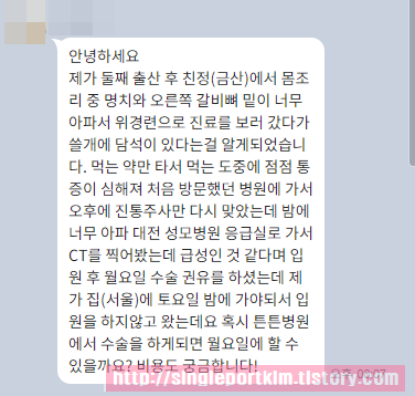 제가 둘째 출산 후 친정(금산)에서 몸조리 중 명치와 오른쪽 갈비뼈 밑이