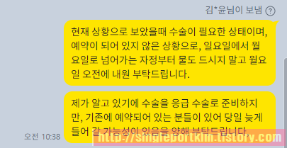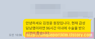 급성인 것 같다며 입원 후 월요일 수술 권유를 하셨는데 제가 집(서울)에 토요일 밤에 가야되서