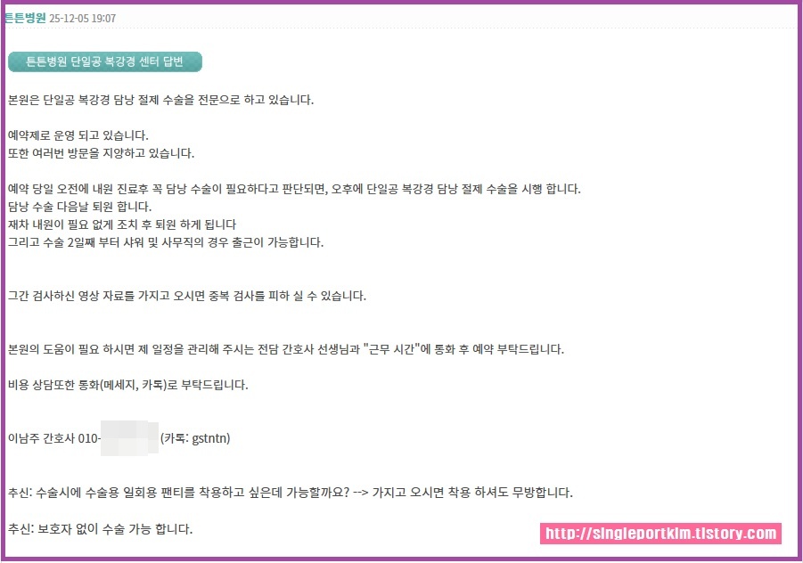 오후에 단일공 복강경 담낭 절제 수술을 시행 합니다.