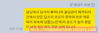 피로 역류되어 피속에 담즙(노란색)의 농도가 높아 황달이 보일 정도까지 겪은 상태 입니다.