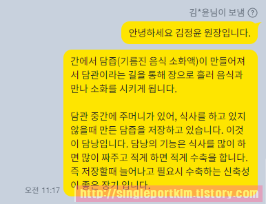 간에서 담즙(기름진 음식 소화액)이 만들어져서 담관이라는 길을 통해