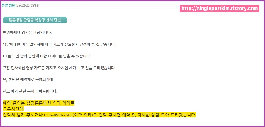 예약 문의는 청담튼튼병원 외과 외래로 근무시간에 연락처 남겨 주시거나