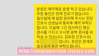 김유정 간호사 010-****-**** 입니다. 휴진인 관계로 월요일에 통화 부탁드립니다.